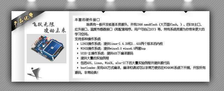 • 除具有一般开发板基本资源外,并有128M nandflash(大页面flash,)、四USB主口、红外接口、温度传感器接口(附配套程序,用户可自己DIY)等,特有系统资源为你带来更大的学习空间。